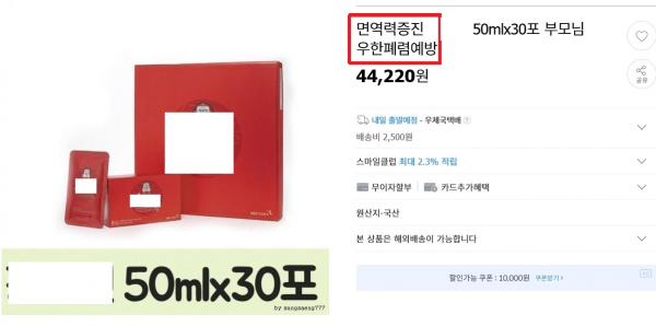 홍삼, 식초, 건강기능식품 등이 호흡기 감염, 코로나19 등의 예방·치료 효과가 있는 것처럼 표시·광고 식약처는 코로나19 장기화로 온라인 소비가 증가함에 따라 점검을 강화하고 질병 예방·치료 효능 등을 홍보하는 부당한 광고에 현혹되지 말 것을 당부하고 있다.