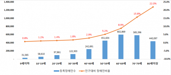2020년 신규 등록장애인은 총 8만 3000명으로 그중 65세 이상 노년층 비율이 55.1%, 심하지 않은 장애인 비율은 67.8%로 연도별 증감 추세가 심화하고 있으며 주요지표별 현황은 아래와 같다.