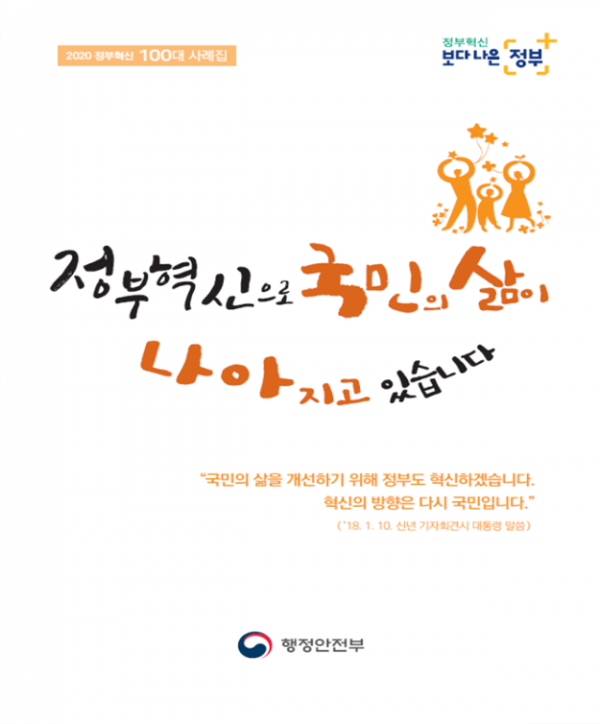 행정안전부는 범정부적 혁신 추진을 통해 국민 삶에 도움을 준 사례를 확산하기 위해 2020 정부혁신 100대 사례집 ‘정부혁신으로 국민의 삶이 나아지고 있다’를 발간했다고 밝혔다.