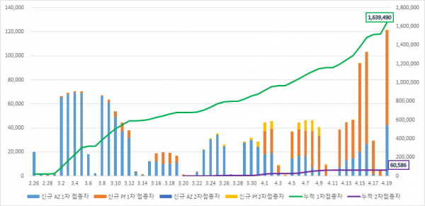 이는 4월 15일부터 예방접종센터 104개소 추가 개소 및 4월 19일 지정 위탁의료기관 접종 시작으로 일별 접종역량이 증가한 결과이다.
