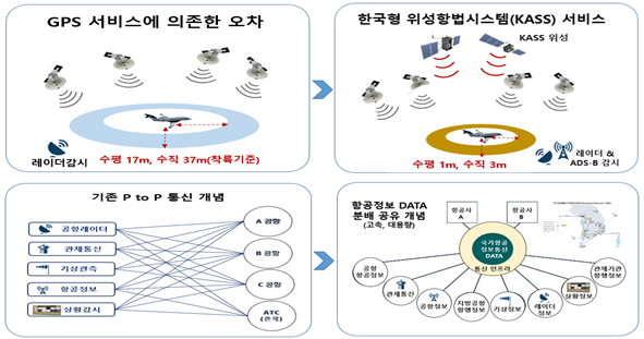 이러한, 첨단 항행시스템에서 제공되는 위치정보 등은 항공기에 정밀 착륙과 성능을 기반으로 하는 운항이 가능하도록 하고 지상의 관제사에게 정밀 감시를 도와 항공기 충돌을 방지하고 수용량 증대, 무인항공기와의 조화로운 항행에 기여하게 된다.
