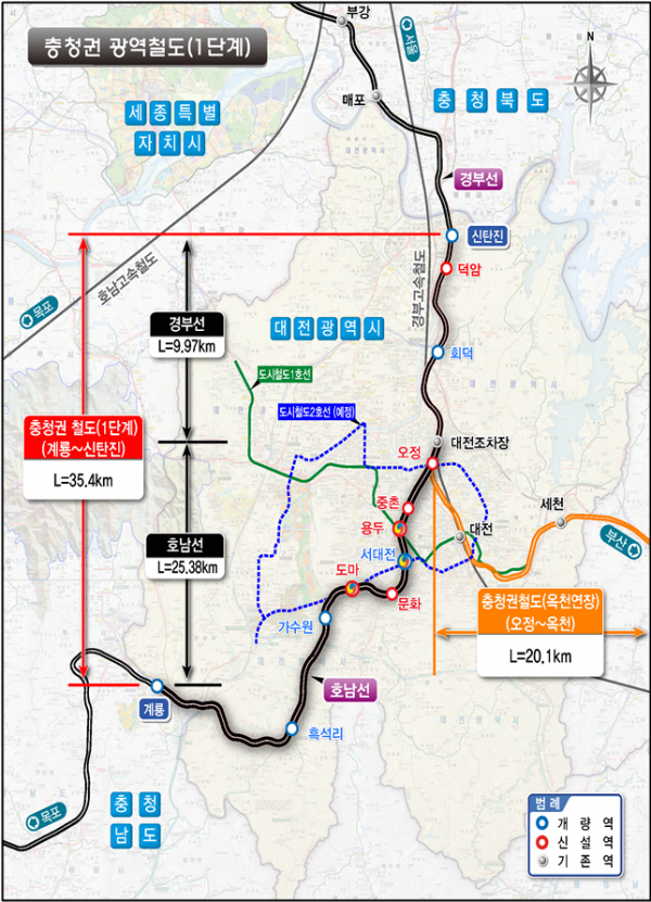충청권 광역철도 1단계는 계룡~신탄진 구간에 정거장 12개소를 설치하며 총 사업비는 약 2,307억원이다.
