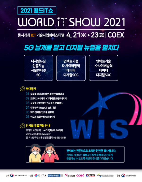이번 월드IT쇼는 행사 내내 코로나19 사회적 거리두기 방역수칙을 준수해 사전·사후 방역실시, 손소독, 발열 검사 등 철저한 방역조치 하에 진행하며 코로나19로 인해 참석 못하는 국민·ICT 국내외 관계자들에게 전시회 현장 분위기를 전달하기 위해 실시간 생중계, 전문 유튜버 및 온라인 기자단 운영, 비대면 컨퍼런스 등 다양한 비대면 플랫폼을 운영하고 있다.