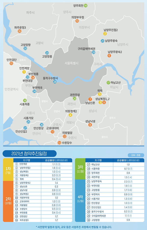 우선 7월에는 3기 신도시인 인천계양지구에서 1.1천호가 공급되며 위례신도시 4백호, 성남복정지구 1천호 등도 계획되어 있다.
