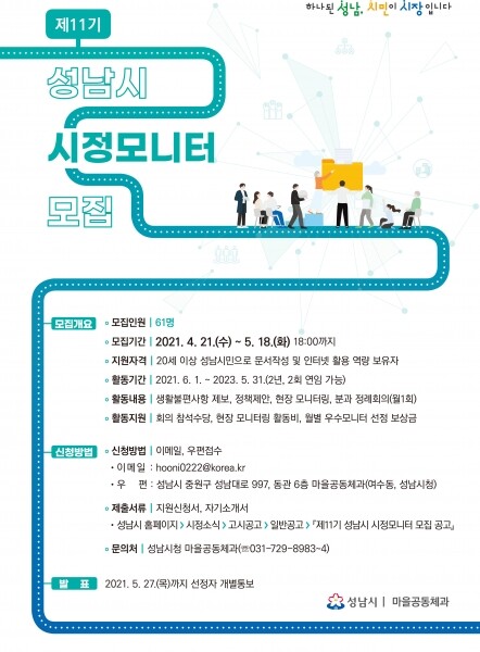 기한 내 성남시 홈페이지에 있는 신청서와 자기소개서를 작성해 시청 6층 마을공동체과로 우편 발송·접수하거나 담당자 이메일로 보내면 된다.