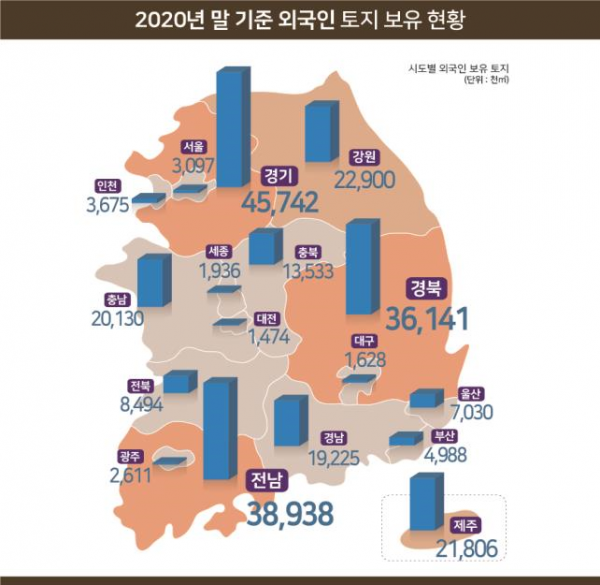 경기도가 4,574만㎡로 외국인이 가장 많은 토지를 보유하고 있는 지역이며 전남 3,894만㎡, 경북 3,614만㎡, 강원 2,290만㎡제주 2,181만㎡ 순으로 보유면적이 큰 것으로 나타났다.