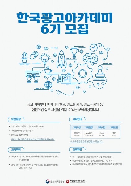 현직 광고전문가로 구성된 심사위원단의 심사를 거쳐 최종 50명을 선발할 예정이며 선발된 교육생은 5월 말부터 10월까지 약 5개월간 무료로 광고 실무 교육을 받게 된다.