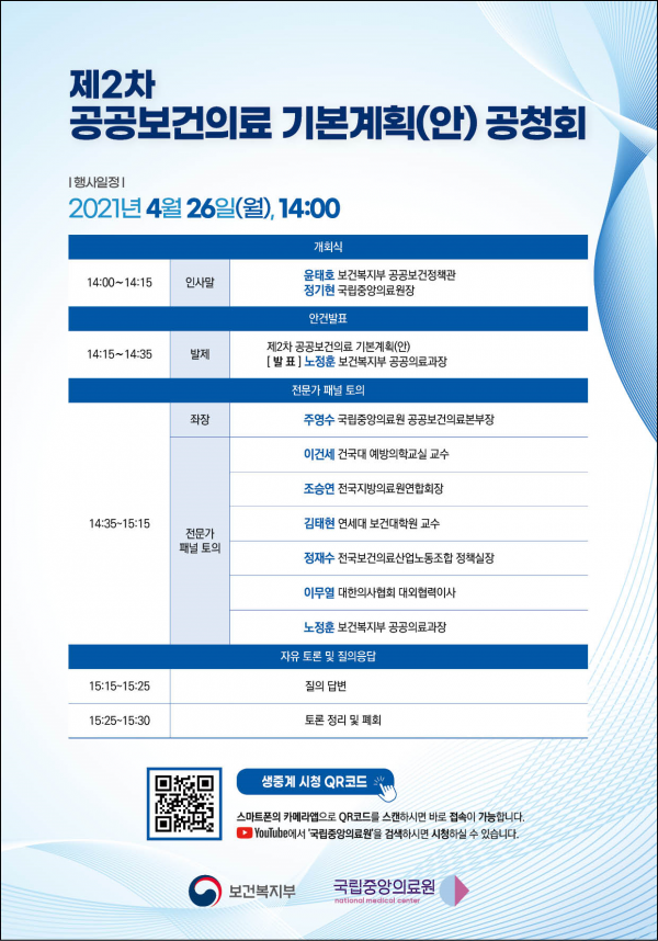 이번 공청회는 코로나19 상황을 감안해 발표자 등 위주로만 현장에 참석하고 공공보건의료에 관심이 있는 누구나 비대면으로 참여할 수 있도록 온라인 생중계한다.