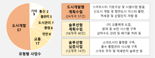 공모접수 결과를 유형별로 살펴보면, 스마트 도시개발형은 24개국에서 57건을 제출했으며 도시 전체에 대한 스마트도시 개발 로드맵 수립에서부터 위성도시 건설, 혁신개발지구 개발, 산업단지 개발까지 다양한 요청이 있었다.