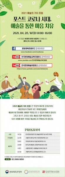 문체부 정책 담당자는 “코로나19의 장기화로 우울감을 느끼는 국민이 많아지면서 예술이 가진 치유의 힘에 대한 관심이 매우 높아졌다”며 “이번 토론회가 그동안 막연히 논의되어온 예술의 가치에 대한 사회적 공감대를 형성하는 것은 물론 예술치유 정책 개발을 위한 다양한 논의의 장이 되었으면 한다”고 밝혔다.