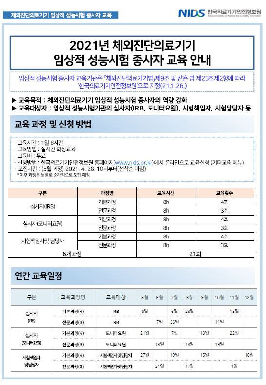임상적 성능시험 종사자는 4월 28일부터 식약처장이 지정한 교육기관인 ’한국의료기기안전정보원‘을?통해 신청 가능하고 매년 8시간 이상의 교육을 의무적으로 이수해야 한다.