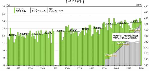 전 지구에 비해 우리나라 연평균기온 증가는 +0.8℃, CO2 농도는 +6.5ppm 높게 나타나, 우리나라 온난화·도시화가 전 지구 평균보다는 빠르게 진행되고 있음을 알 수 있다.