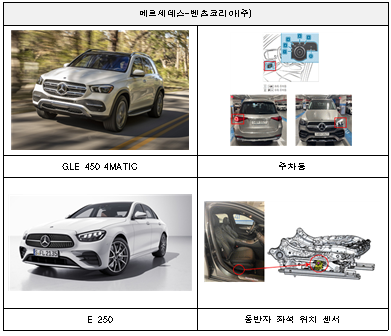 또한 E 250 등 11개 차종 1,461대는 동반자 좌석 위치 센서의 납땜 불량으로 차량 충돌 시 에어백 및 안전벨트 조임 장치가 작동되지 않아 탑승자에게 상해를 입힐 가능성이 확인되어 시정조치에 들어간다.