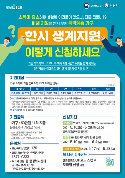 올해 1~5월 소득이 2019년 또는 2020년 소득보다 줄어든 가구 중에서 기준중위소득 75%, 재산 3억5000만원 이하인 가구에 지급한다.