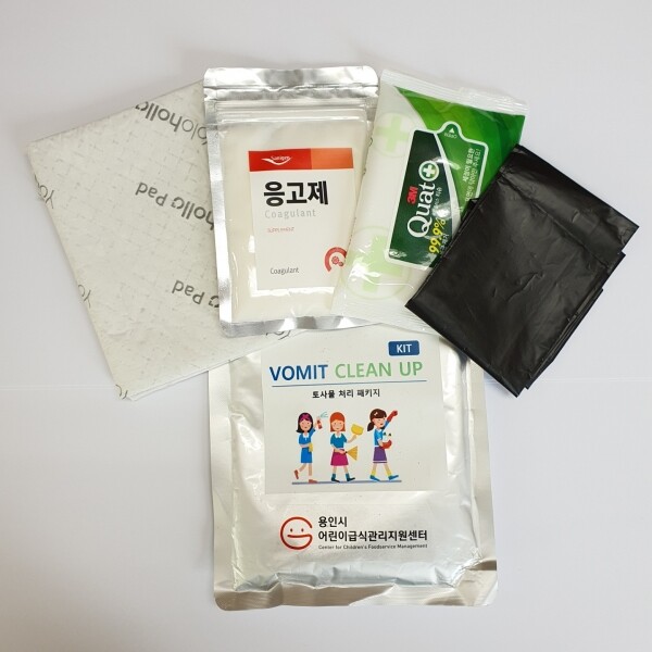 이 키트는 응고제, 패드, 일회용 장갑·마스크, 폐기용 봉투 등이 담겨있다.