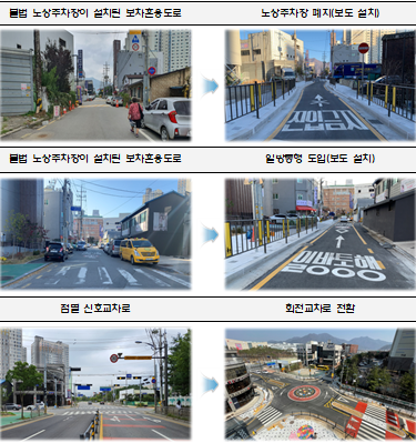 또한, 과속·주정차 단속장비 등 교통안전시설을 설치하고 점멸 신호등으로 운영되던 교차로 지역은 회전교차로로 변경했다.