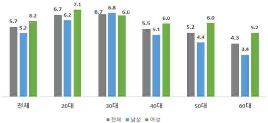 우울 점수는 20대 여성이 7.1로 가장 높았고 우울 위험군 비율은 30대 여성이 31.6%로 가장 높았다.