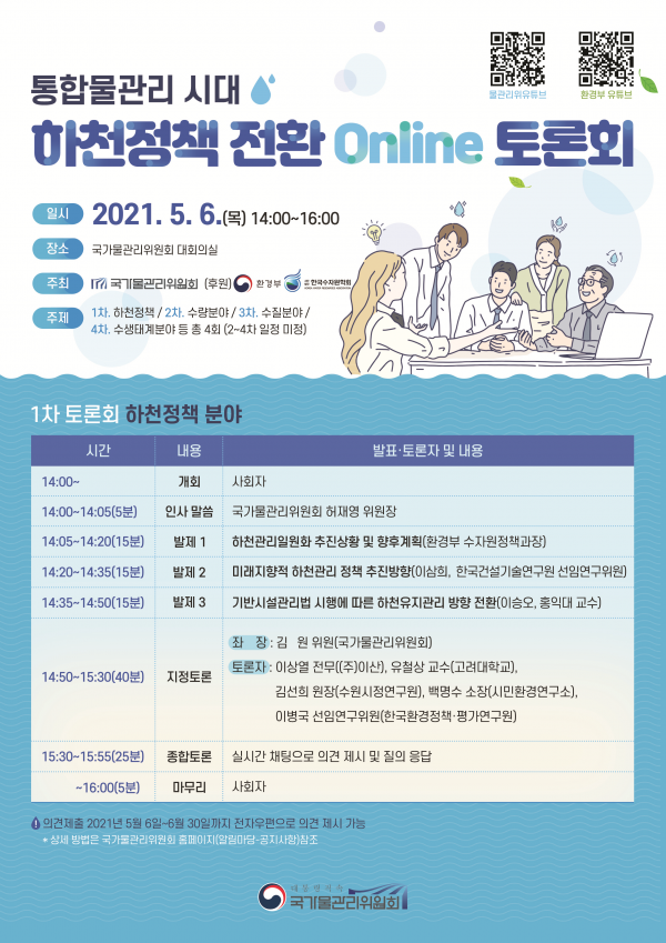 이날 토론회는 하천관리 정책에 대한 다양한 의견을 수렴하기 위해 국가물관리위원회와 환경부 유튜브를 통해 방송됐으며 실시간으로 누구나 참여가 가능하다.