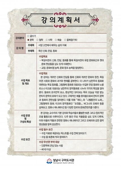 참여하려는 40세 이상 성남시민은 오는 5월 31일까지 구미도서관 홈페이지를 통해 선착순 신청하면 된다.