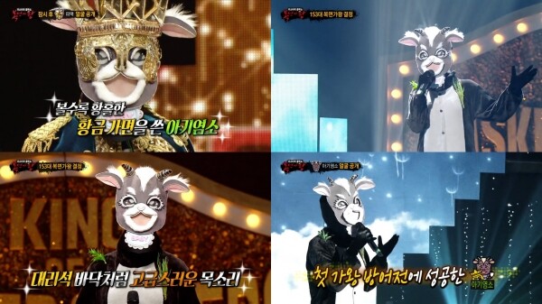쭉 뻗어나가는 사이다 고음이 돋보이는 감미로운 무대에 보는 이들 모두의 사로잡은 것. 이어 4연승 가왕으로 향하는 문턱에서 고배를 마신 ‘아기염소’는 가면을 벗고 정체를 드러냈다.