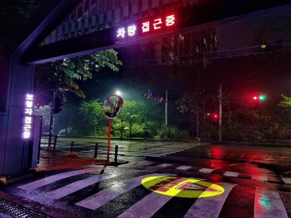이곳은 근린공원과 동 행정복지센터를 찾는 보행자와 차량 통행량이 많은데다 지하 주차장 출구 경사가 커 보행자를 인식하기 어려워 안전사고 위험이 있었다.