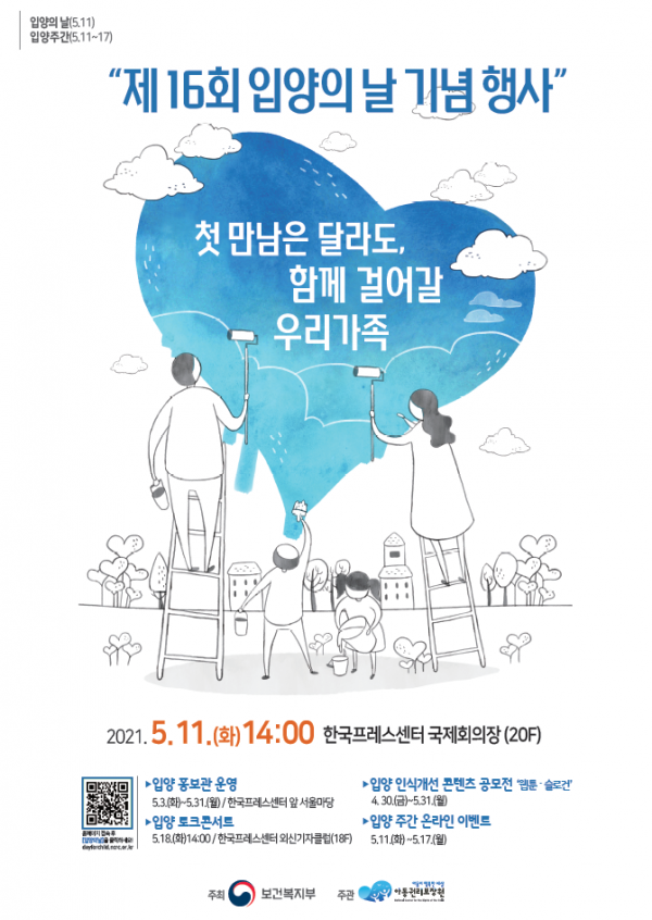 아울러 5월 11일부터 17일까지 7일간을 입양주간으로 해 아동권리보장원 누리집을 통해 입양인식 개선을 위한 다양한 콘텐츠 공모전과 이벤트 등을 진행한다.