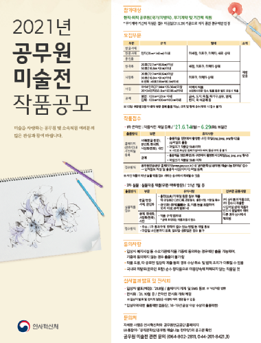 인사혁신처는 ‘2021년 공무원 미술전’을 처음으로 온라인 전시회로 개최하고 이를 위한 작품 공모를 6월 14일부터 29일까지 16일간 진행한다고 11일 밝혔다.