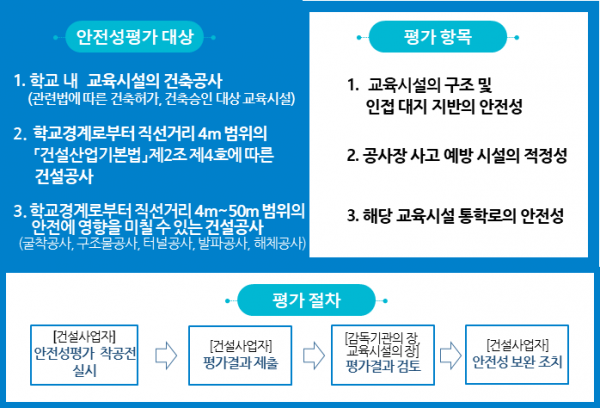 건설사업자가 공사로 인해 발생할 수 있는 위험요인으로부터 학교·학생 안전을 확보하고 불편을 최소화할 수 있도록 안전성평가 실시 및 안전대책 마련을 위한 구체적인 절차와 기준을 마련하고 교육시설의 상태 분석과 굴착공사 및 해체공사로 인한 안전 조치, 공사장 가설 및 화재 안전관리, 통학로 안전 및 공사차량 교통처리 방안 등에 대해 안전성평가를 실시하도록 했다.