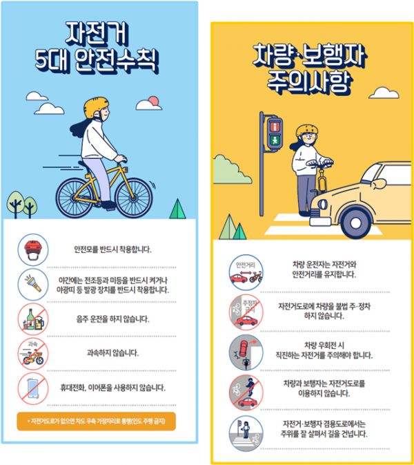 임경숙 행정안전부 예방안전과장은 “요즘은 야외에서 활동하기 좋은 시기로 자전거를 즐기시는 분들이 많은데, 자전거는 누구나 편리하게 이용할 수 있는 만큼 항상 안전수칙을 준수하고 사고 예방에 각별히 주의해야 한다”고 했다.