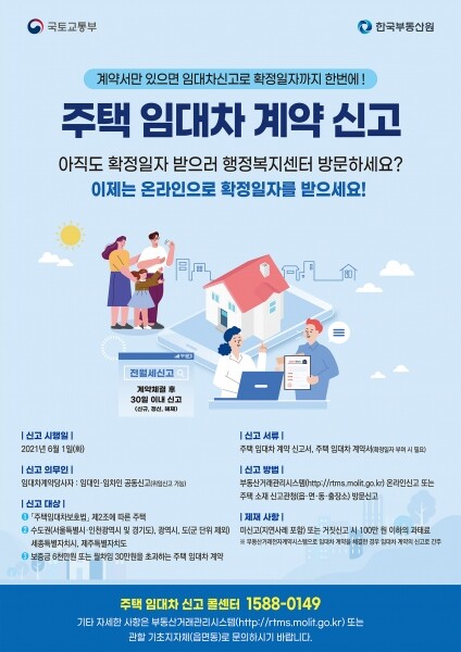 신고제 적용 대상은 6,000만원 또는 월세 30만원을 초과하는 주택 임대차 계약 주택이며 계약 체결일로부터 30일 이내에 계약의 내용을 의무적으로 신고해야 한다.