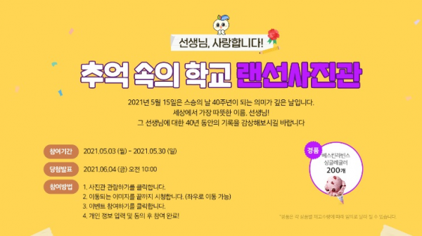 교육부는 스승의 날을 계기로 국민들이 자연스럽게 추억 속의 선생님을 떠올리며 감사의 마음을 표현할 수 있도록 지난 5월 3일부터 5월 30일까지 다양한 비대면 행사를 진행하고 있다.