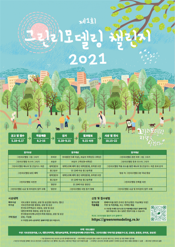 다양한 연령대의 관심과 호응을 유도하기 위해 여러 부문별로 그린리모델링 관련 작품을 모집·시상하고 다양한 매체를 통해 공유·확산해 그린리모델링 활성화를 유도할 계획이라고 전했다.