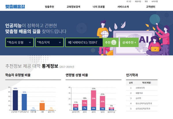이번에 개통되는 ‘맞춤배움길’은 성인학습자의 시간적, 공간적 제약이 따르는 특성을 반영해 20개 원격대학의 교육관련 자료를 기반으로 인공지능이 분석한 학습자 맞춤형 교육과정을 추천한다.