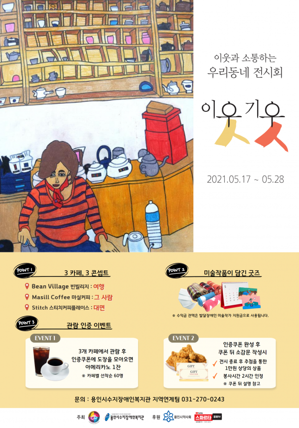 또한 발달장애인 아티스트들의 작업과정을 알리기 위해 딱딱한 전시회장이 아닌 가볍게 작품을 접할 수 있도록 복지관 인근 카페 3곳에서 전시회가 열린다.