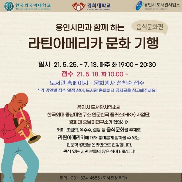 시 도서관 관계자는 “관내 대학인 한국외대 중남미연구소 인문한국 플러스 사업단 및 경희대 중남미연구소와 협업해 특별한 온라인 강연을 기획했다”며 “라틴아메리카에 대해 깊이 있게 알아볼 수 있는 좋은 기회가 되길 바란다”고 말했다.