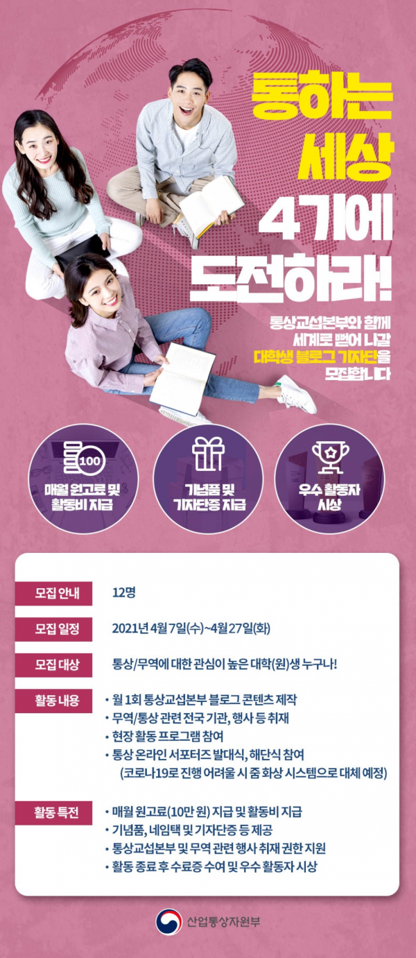 김성열 산업부 통상법무정책관은 “통상 온라인 서포터즈는 미래 통상인력을 양성하기 위한 산업부의 다양한 프로그램 중 하나”며 “글로벌 인재들이 이번 활동을 통해 통상역량을 보다 강화할 수 있길 바란다”고 말했다.