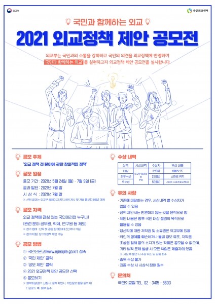 응모방법은 5.24.부터 7.9.까지 국민신문고 홈페이지에 게시되어 있는 외교정책 제안 공모전 참가신청서를 작성해 제출하면 된다.