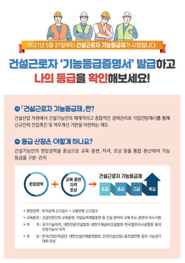 객관적으로 검증된 현장 근무경력과 건설근로자가 보유한 자격, 교육, 포상이력을 종합해 환산경력을 산정하고 환산경력을 기준으로 3년 미만은 초급, 3년 이상인 경우 중급, 9년 이상인 경우 고급, 21년 이상인 경우 특급의 기능등급을 부여한다.