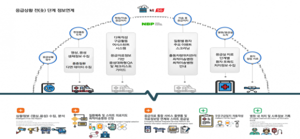 지능형 응급의료시스템은 구급차 안에서 실시간으로 중증응급환자의 다양한 정보를 수집해 5세대 이동통신망을 통해 인터넷기반자원공유서비스 기반 응급의료 통합분석 플랫폼으로 전송한다.