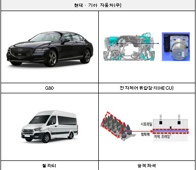 첫째, 현대·기아자동차㈜에서 제작, 판매한 제네시스 G80 등 4개 차종 700,583대는 전자제어 유압장치 내부 합선으로 화재가 발생할 가능성이 확인됐고 쏠라티 158대는 승객 좌석의 고정 불량으로 충돌시 승객 좌석이 이탈될 가능성이 확인되어 우선 시정조치를 진행하되, 추후 시정률 등을 감안해 안전기준 부적합으로 과징금을 부과할 계획이라고 전했다.