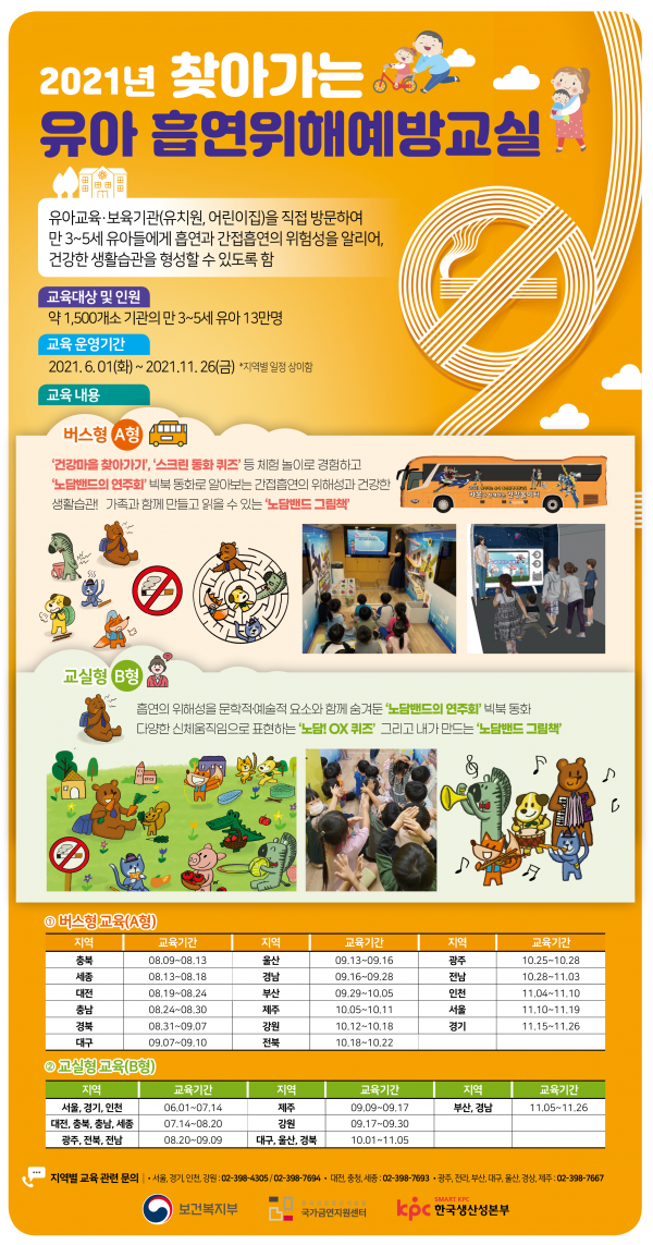 ‘2021년 찾아가는 유아 흡연위해예방교실’의 지역별 일정 등 자세한 사항은 국가금연지원센터 금연두드림 누리집에서 확인할 수 있으며 기타 문의사항은 지역별 전화를 통해 상담할 수 있다.