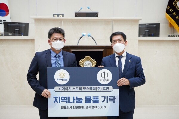 이날 전달식에는 김기준 의장을 비롯해 임정민 비에이치스토리 코스메틱 대표, 박동희 한국자유총연맹 용인시지회 회장 등이 참석했다.