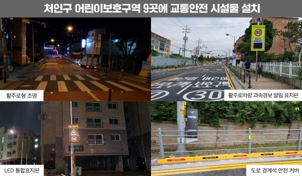 이들 초등학교 일대엔 차량 과속경보 알림 표지판 14개, 어린이보호구역임을 알리는 LED 통합표지판 20개, 도로 경계석 안전 커버 100개, 활주로형 조명등 122개, 어린이보호구역 주정차금지 반사 스티커 256개 등이 설치됐다.