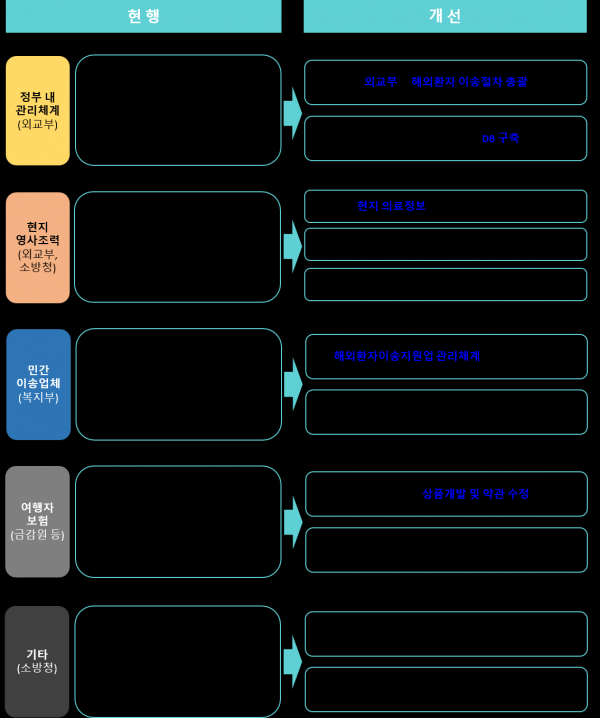 해외환자 이송은 국민의 생명·안전과 직결되는 사항이나 그동안 국내 거주 국민과의 형평성과 자기책임의 원칙 등으로 정부 내 관리체계 구축이 미흡했다.