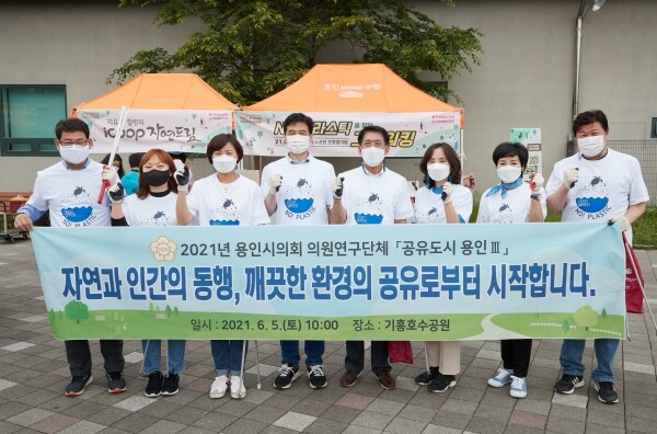 이날 연구단체 회원들은 김기준 의장, 김민기 국회의원, 용인아이쿱생협회원 및 자원봉사 학생들과 함께 기흥호수공원을 돌며 쓰레기를 수거하고 환경보호를 위한 캠페인을 벌였다.