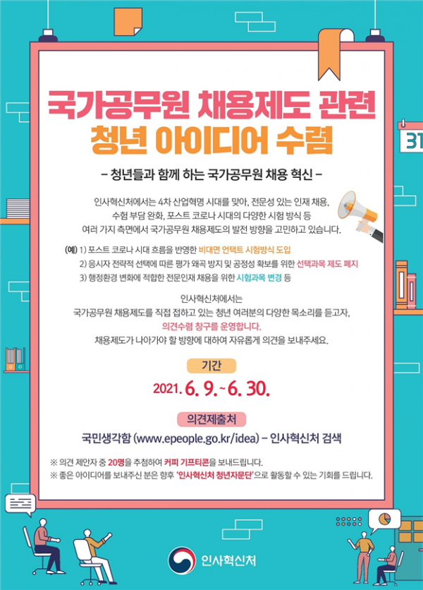 인사혁신처는 국가공무원 채용제도를 직접 접하고 있는 청년들의 의견 수렴을 위한 청년제안 창구를 오는 30일까지 운영한다고 8일 밝혔다.