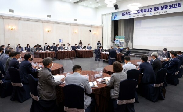 이날 용인시청 컨벤션홀에서 열린 ‘2022년 경기도종합체육대회 제1차 준비상황보고회’에는 백군기 시장을 비롯해 간부 공무원, 용인시체육회, 용인시장애인체육회, 읍면동 체육협의회 등 관계자들이 참석했다.