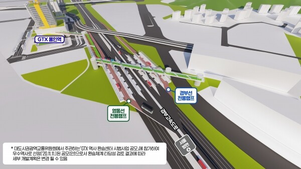 상공형 환승정류장은 GTX용인역 인근 경부고속도로 상부에 보행자 다리를 연결해 GTX에서 고속도로는 물론 버스와 지하철로 편리하게 환승할 수 있도록 한 것이다.