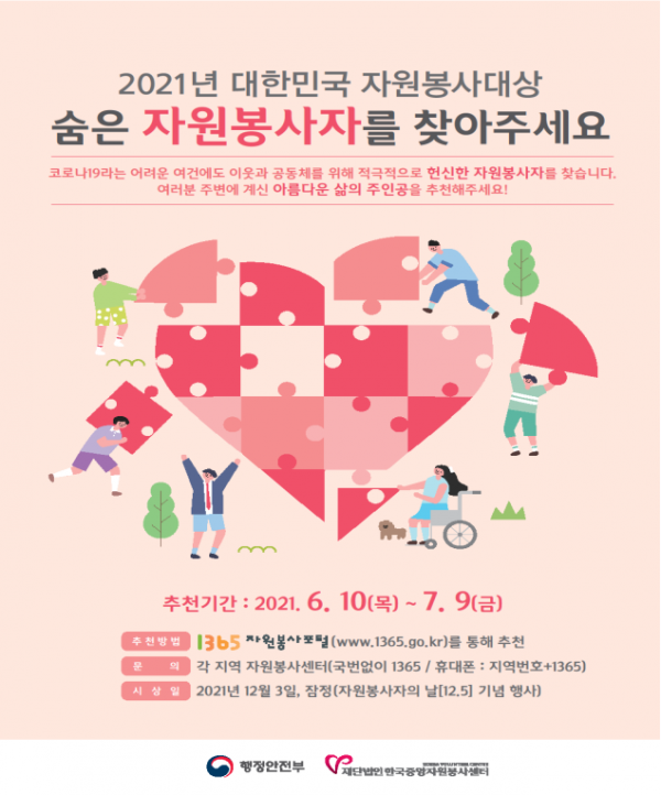 최병관 행정안전부 지방행정정책관은 “올해는 특히 자원봉사를 통해 코로나19 극복에 힘을 모아준 유공자를 중점 발굴할 예정”이며 “자원봉사자들이 자부심과 긍지를 가지고 활동할 수 있도록 예우를 강화하고 자발적 참여문화를 조성하는데 힘써나갈 것”이라고 밝혔다.