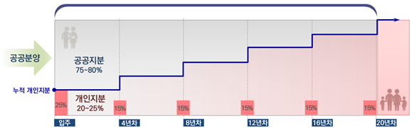 지분 적립은 수분양자 부담이 최소화되도록, 매 회차 10~25%의 범위에서 지분을 취득하도록 하고 지분 취득가격은 최초 분양가에 지분 취득 시까지의 1년 만기 정기예금이자를 합산한 금액을 기준으로 산정한다.